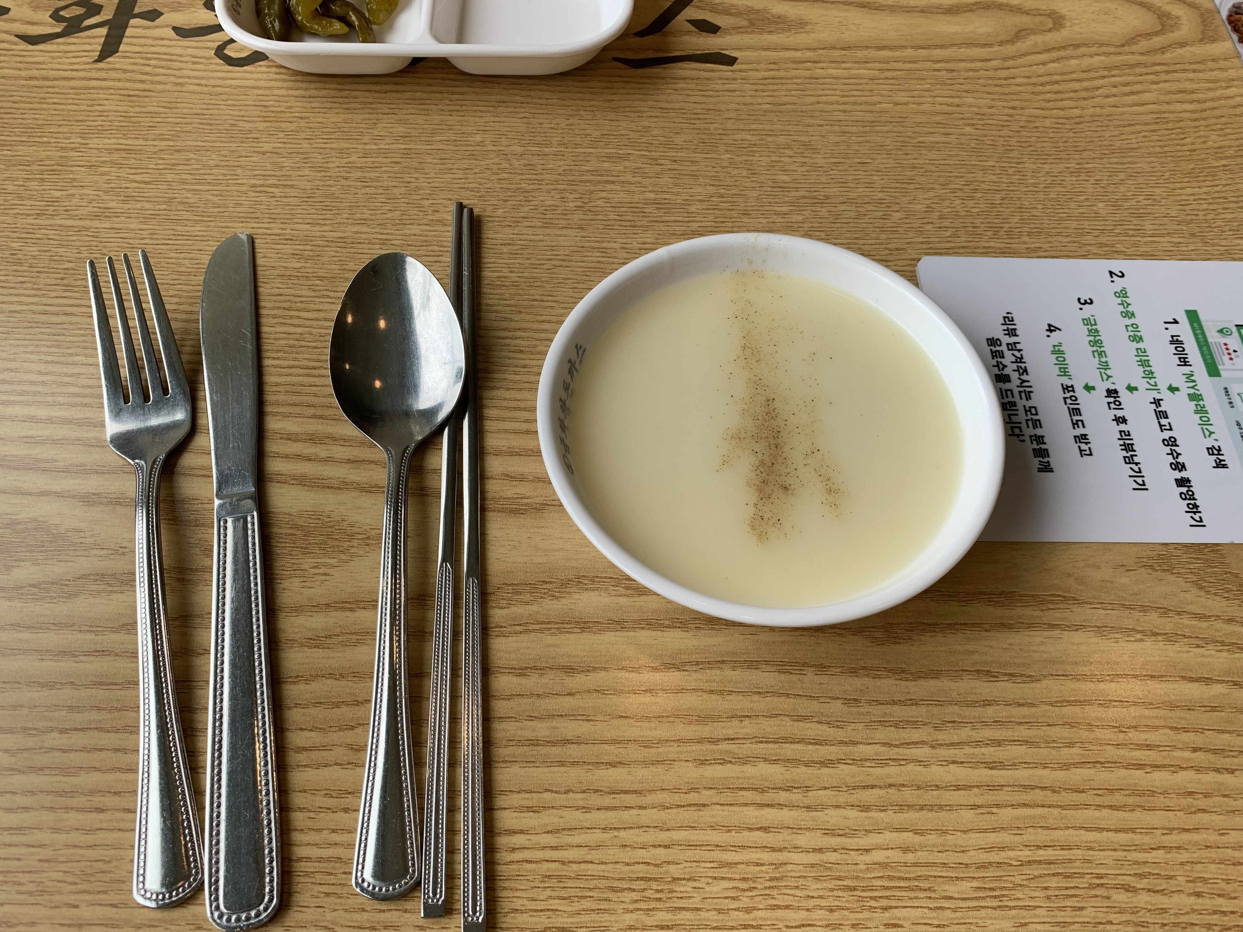 기본찬들이나 포크,나이프등을 챙길 수 있구요, 이렇게 스프도 있어서 마음껏 드실 수 있습니다